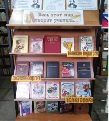 В рамках этого события в нашей библиотеке оформлена книжная выставка «Весь этот мир творит учитель». Выставка состоит из трех разделов: «Великие педагоги», «Писатели-педагоги», «Школьная Вселенная».